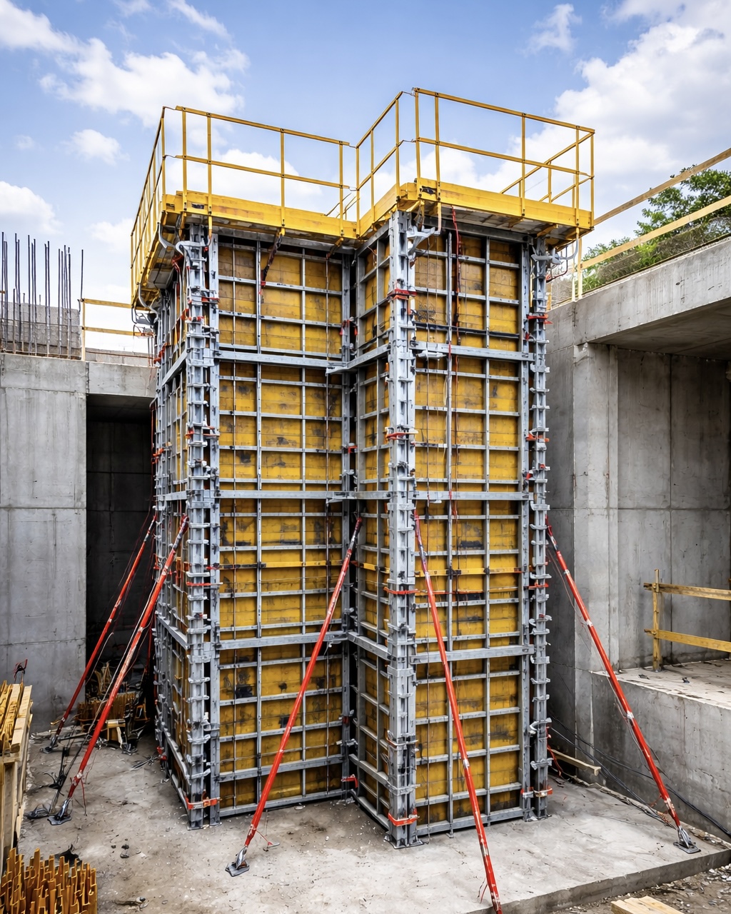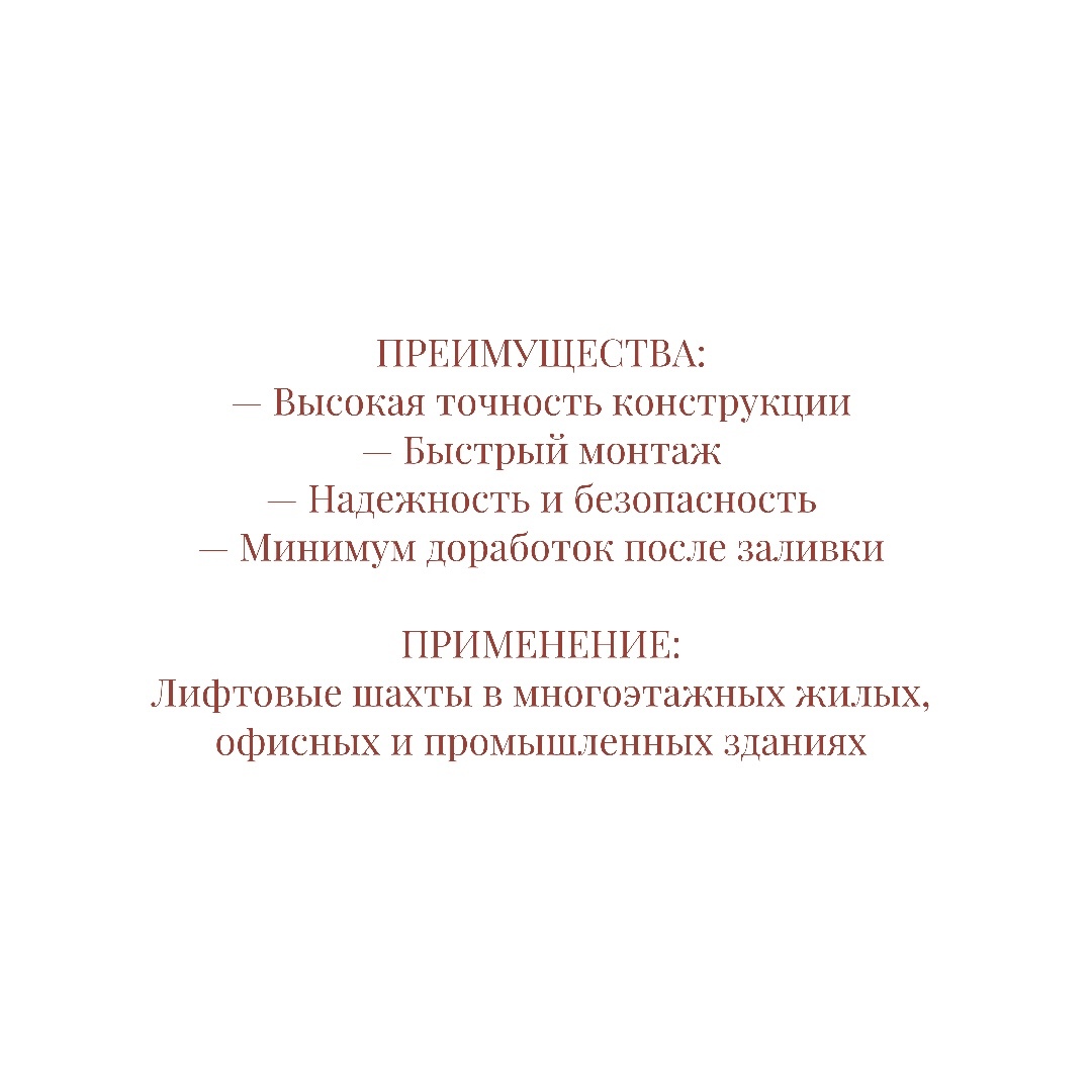 Опалубка лифтовых шахт — это специализированная система, предназначенная для точного и безопасного возведения вертикальных конструкций сложной формы. Она обеспечивает строгую геометрию шахты, что особенно важно для последующей установки лифтового оборудования и бесперебойной эксплуатации. Конструкция опалубки позволяет выполнять работы быстро и с минимальными трудозатратами, обеспечивая ровные поверхности и высокое качество бетона без дополнительных доработок. Опалубка лифтовых шахт подходит для бетонирования конструкций любой высоты и сложности, гарантируя надежность, точность и сокращение сроков строительства.